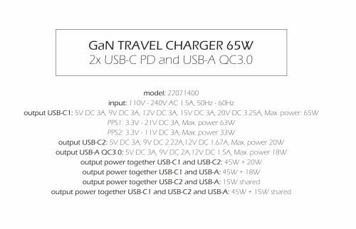 Univerzální napájecí adaptér s výkonem až 65 W. Pro nabíjení zařízení jsou k dispozici dva USB-C konektory a jeden USB konektor. Adaptér podporuje protokoly rychlého nabíjení Power Delivery a Quick Charge 3.0. Použitá GaN technologie snižuje tvorbu tepla, čímž zvyšuje účinnost nabíječky při zachování kompaktních rozměrů (36 × 36 × 50 mm). Díky vyššímu výstupnímu výkonu umožňuje dobíjet také vybrané notebooky s USB-C portem a podporou Power Delivery.