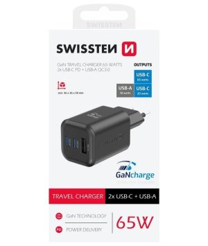 SWISSTEN GaN 2× USB-C PD 65 W + 1× USB QC 18 W