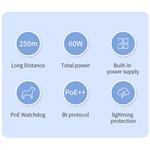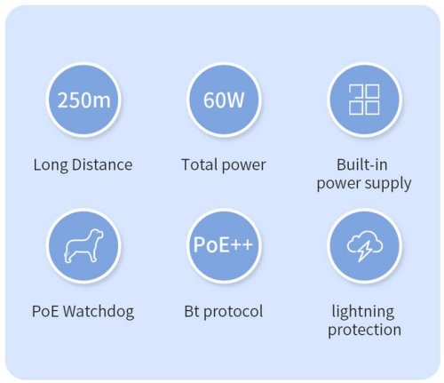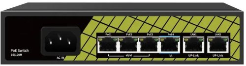 Switch není vybavený ventilátorem, proto má tichý chod. LAN porty vám navíc zajistí přenosovou rychlost 10/100 Mbps. 4 ethernetové porty podporují funkci PoE s celkovým budgetem 60 W (30 W na port, u 4. portu sahá hodnota k 60 W). Napájení probíhá přes AC konektor díky vestavěnému zdroji.