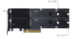 Synology M2D20 je karta adaptéru M.2 NVMe SSD určená k navýšení výkonu vstupu/výstupu zařízení NAS. Schopnost zpracování více front disků NVMe SSD významně napomáhá v aplikacích citlivých na latenci, jako je indexování fotografií, hledání souborů a nasazení virtualizace.