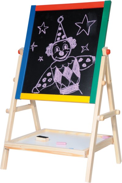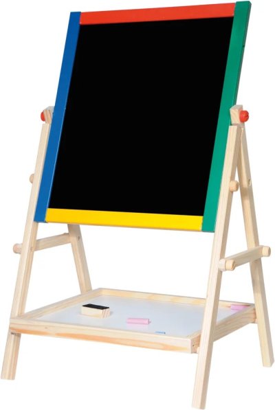 Pořiďte svým potomkům kvalitní dřevěnou tabuli s rámem a praktickou poličkou. Jedna strana je černá, na tu mohou psát klasickými křídami, na bílou stranu zase suchými fixy. Psací pomůcky si odloží na prostornou poličku. Bílá strana je vyrobená z kovového plechu, takže na ni mohou vaši nejmenší připevňovat různé magnety. Pro kreslení mají k dispozici plochu o rozměrech 30 x 35 cm. Tabule má i se stojanem výšku 65 cm. Krásné barevné provedení rámu zaujme na první pohled.