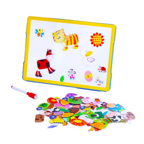 Skvělá magnetická tabulka s obrázky pro kreativní dětičky. Vytvoř si obrázek podle své fantazie! Pokud si nebudeš vědět rady, můžeš pochytit inspiraci v šablonách, které jsou vyobrazeny na zadní straně obalu. Balení obsahuje cca 105 magnetických kousků. Součástí je fix, kterým můžeš na tabulku psát či kreslit. Tabulka má rozměr 29 x 21 cm a je opatřena praktickým stojánkem na stůl. Tato hračka rozvíjí smyslové vnímání, motoriku a trpělivost.
