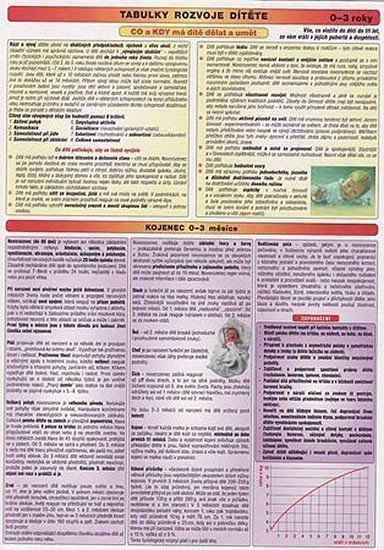 Co a kdy má dítě znát a umět, dělat a také nedělat. V názorných a přehledných tabulkách je časově sestaven rozvoj dítěte po stránce tělesné, rozumové, citové a mravní, pracovní a estetické. Tabulky zachycují vývoj dítěte od jeho narození do věku 3 let. Zachycují období kojence od narození do 18 měsíců a batolete od 18 měsíců do 3 let života. Laminovaný dvojarch formátu A4.