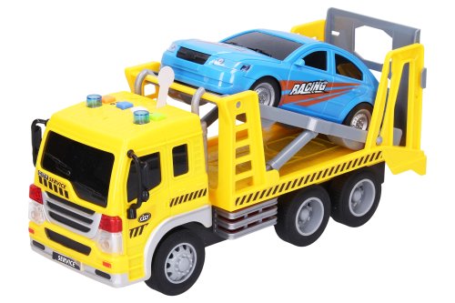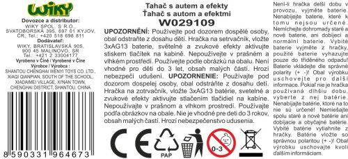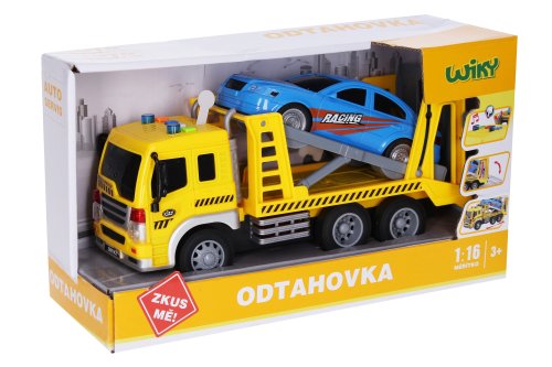 Tahač s autem. Rozměry tahače 26x10x14 cm. Na setrvačník. Světelné a zvukové efekty tlačítky na kabině tahače. 3xAG13 baterie součástí.