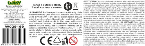 Tahač s autem a efekty. Rozměry 30x13x17 cm. Na setrvačník. Světelné a zvukové efekty tlačítky na kabině tahače. 3xAG13 baterie součástí. Velké oranžové tlačítko na kabině - hydraulika nakládacího ramene - zvedání. Oranžová páčka mezi koly položení (uvolnění) nakládacího ramene.