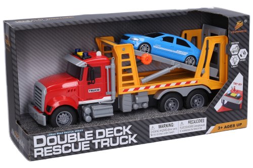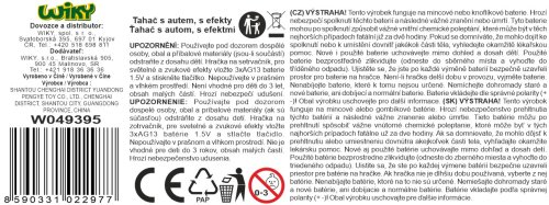 Tahač s autem a efekty. Rozměry 32x9,5x12 cm. Na setrvačník. Světelné a zvukové efekty, aktivace tlačítkem na kabině. 3xAG13 baterie do střechy součástí.