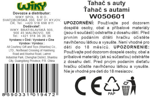 Tahač s auty. Velikost tahače 24 cm. Obsahuje tahač a dvě auta. Volná kola.