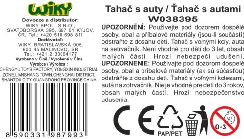 Tahač s auty. Velikost tahače 31 cm. Obsahuje: tahač s volnými koly, 3 autíčka na setrvačník.