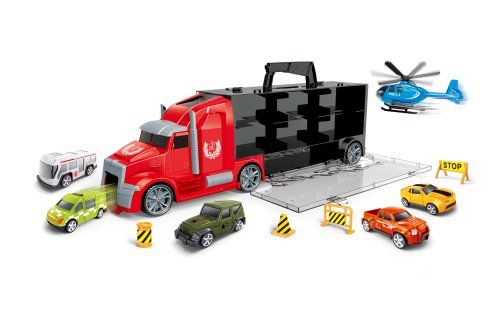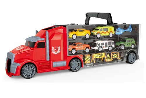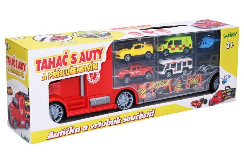 Tahač s auty. Velikost tahače 42 cm. Volná kola. Součástí 5 autíček, 1 vrtulník. Autíčka mohou projíždět skrz kabinu podle obrázku na obalu. Přívěs má zásobník na autíčka z obou stran. Vysunovací držadlo na vrchní části přívěsu pro snadné přenášení.