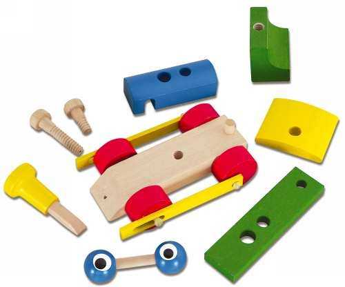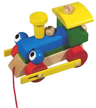 Dřevěná tahací mašinka je složená z montážních částí a přiloženým dřevěným šroubovákem.