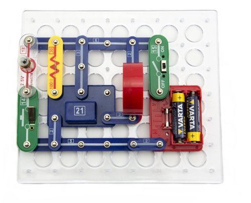 Naučte se zapojovat elektrické obvody, přepínače, světelné a zvukové zdroje nebo dokonce i motor pomocí elektronické stavebnice. Díky jednoduchému ovládání si děti rychle osvojí základy elektroniky a elektrotechniky. Podle podrobného návodu, který je v českém jazyce, si mohou sestavit až 500 elektrických zařízení. V krabici 42x28,5x4 cm. Vhodné od 6 let.