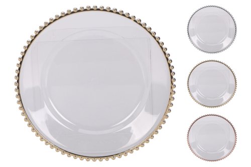 průměr: 33 cm materiál: plast barva: transparentní barevné lemování mix: stříbrná, zlatá, růžová