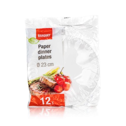 Talíř papírový o průměru 23 cm, 12 ks v sadě. Výrobek využijete na zahradní párty, pikniku apod.