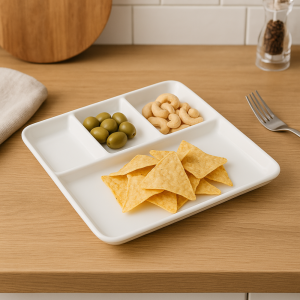 Elegantní talíř z bílého porcelánu, ideální pro servírování snacků, předkrmů nebo malých porcí. Jeho nadčasový design se hodí pro každodenní použití i slavnostní příležitosti.
