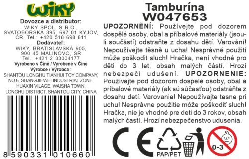 Tamburína 15,5 cm. 2 varianty - modrá, růžová. Přesné rozměry 15,5x3x13 cm.