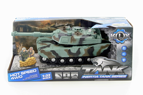 Tank na baterie. Tank vydává zvuky střelby a svítí mu dělo po stisknutí tlačítka, pohon je na setrvačník. Tank v měřítku 1:32. Tank má otáčecí dělo (doleva, doprava, nahoru, dolů). Napájení na baterie 3x AG13 (jsou součástí balení). Rozměr tanku cca 22 x 8 cm. Věk 3+.