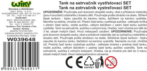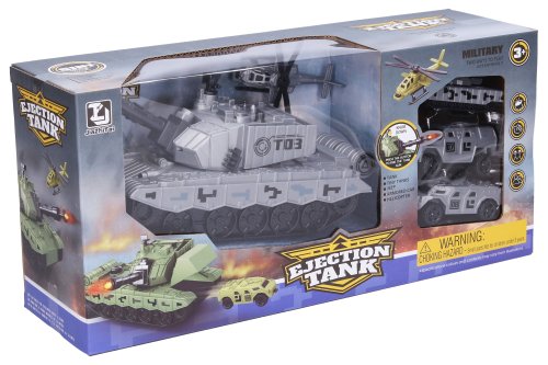 Tank na setrvačník vystřelovací. Velikost 21 cm. Vystřelování šipek - šipku zasuňte do kanónu tanku, tlačítkem na kanónu vystřelíte. Vystřelovací garáž na auta v přední části tanku - odklopte dvířka, vložte autíčko, velkým tlačítkem v zadní části tanku vystřelíte. Obsah balení - tank 21 cm, 3x vojenské auto 7 cm volná kola, vrtulník 8 cm, 8 šipek do tanku. Obrázkový návod na obalu.