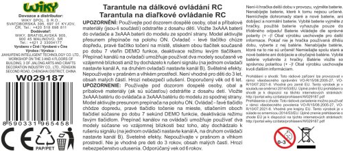 Tarantule RC na dálkové ovládání. Rozměry 24x23x8 cm. Světelné efekty - svítící oči. 3xAAA baterie do tarantule, 3xAAA do ovladače nejsou součástí. Přepínač ON/OFF na spodní straně tarantule. Infračervený port. Přepínač kanálů A,B,C na ovladači. Levé tlačítko - chůze dopředu, pravé tlačítko - otáčení namístě. DEMO režim - současný stisk obou tlačítek po dobu 7 vteřin, deaktivace levým tlačítkem.