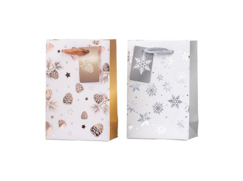Taška dárková 100x150 mm vločky, šišky mix, bílá, bronzová, šedá