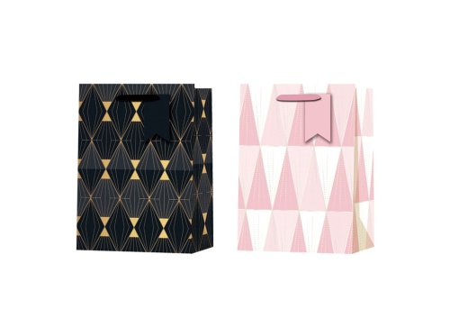 Dárková taška o rozměru 100×50×150 mm s moderním motivem geometrických tvarů v kombinaci růžové, bílé, černé a zlaté. Jednotlivé tašky jsou dodávány v mixu a barevné odstíny se mohou mírně lišit.