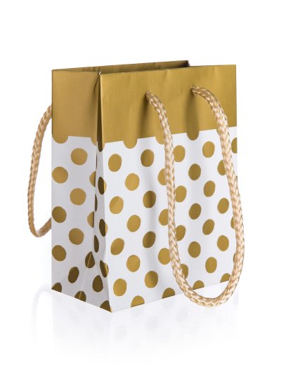 Dárková taška s dekorem ZLATÉ TEČKY, velikost S,, je vyrobena z papíru a vybavena textilním uchem.