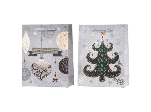 Střední dárková taška o rozměru 180×230 mm s krásnými barevnými motivy vánočního stromku a ozdob v různých variantách. Vyrobena z pevného papíru, doplněná o praktická ucha pro pohodlné přenášení.