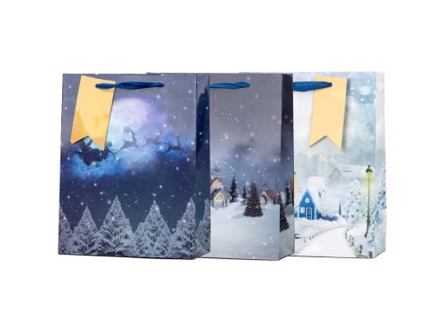 Střední dárková taška o rozměru 180×230 mm s krásnými motivy zimní krajiny v pestrém barevném mixu. Vhodná pro všemožné dárky – kosmetiku, svíčky, dekorace, drobné textilní produkty nebo sladkosti.