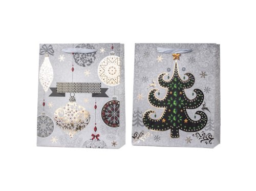 Velká dárková taška o rozměru 260×320 mm s barevným mixem vánočních motivů stromků a ozdob. Taška je vyrobena z kvalitního pevného papíru a doplněna odolnými uchy pro snadné přenášení.