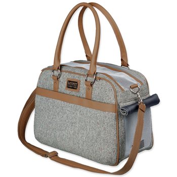 Látková taška zdobená koženkou s pěnovou výplní a kapsou.