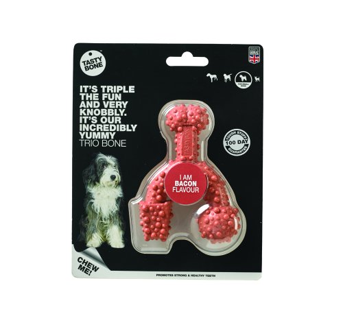 Trojnásobná zábava. Neuvěřitelně lahodná trio kostička. Stejně jako všechny nylonové pamlsky TastyBone i tento byl testován na těch nejenergičtějších mlsounech.