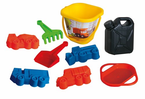 Pískový set, který obsahuje kyblík se sítkem, hrabičky s lopatkou, 4 bábovky Tatra a kanystr