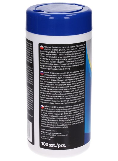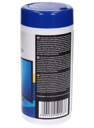 Vlhčené utěrky pro čištění obrazovky. Vhodné pro použití na plochých obrazovkách včetně přenosných a počítačových displejů. Perfektní pro odstranění otisků prstů, prachu a nečistot. Tekutina je antistatická a bez obsahu alkoholu.