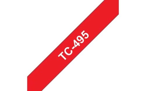Laminovaná páska Brother TC495 se standardním lepidlem pro tisk štítků, bílý tisk na červeném podkladu – šířka 9 mm