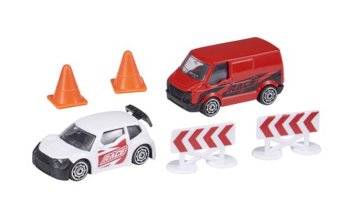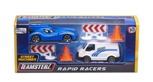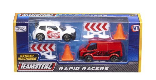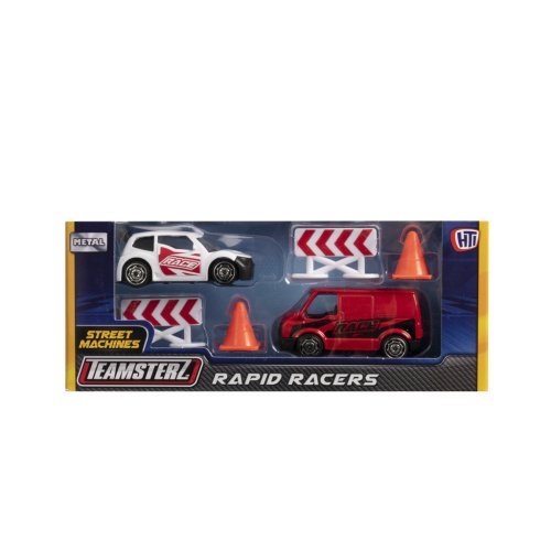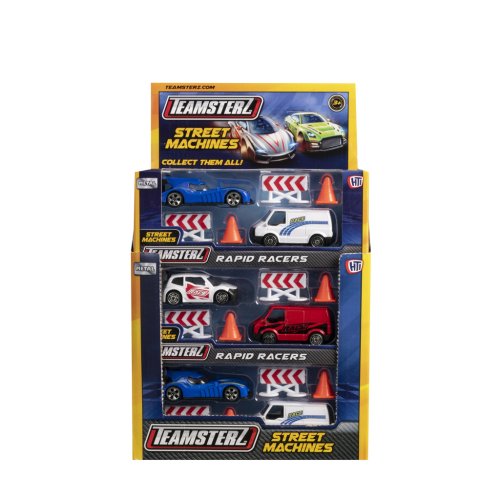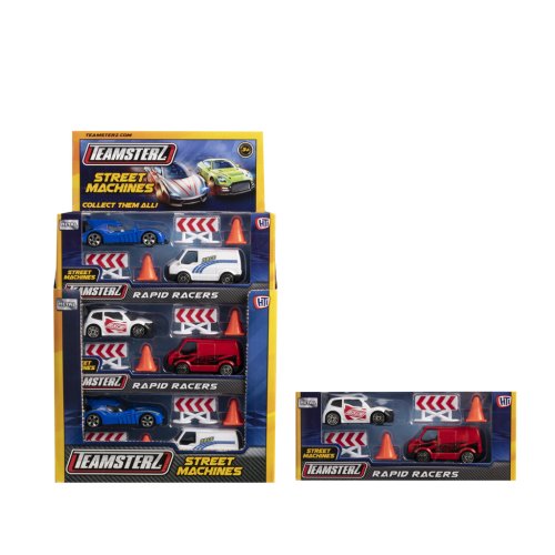 Připravte se na závody! Tato herní sada obsahuje vysoce detailní závodní auto a závodní podpůrnou dodávku se silničním příslušenstvím. Je k dispozici v sortimentu dvou barev a stylů na výběr a zahrnuje 2 kužely a 2 zábrany. Perfektní dárek pro každého malého nadšeného řidiče, který nabízí hodiny nápadité zábavy! Tlakově litá vozidla Teamsterz Street Machines mají měřítko přibližně 3 palce a vyznačují se vysoce kvalitním tlakově litým skeletem karoserie a nezávislými volně pohyblivými koly. Vhodné pro věk 3+.