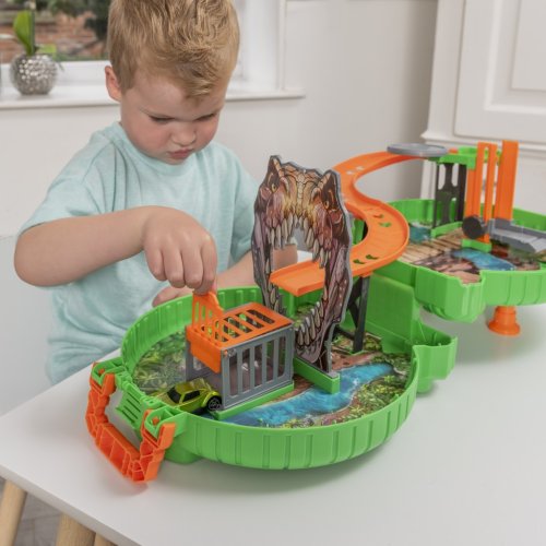 Vydej se na dobrodružství do světa dinosaurů s tímto hracím setem v praktickém kufříku ve tvaru pneumatiky! Díky rukojeti ho snadno přeneseš kamkoli. Set obsahuje výtah, klec, parkovací prostory a únikovou rampu, které poskytují nekonečné možnosti hry. Součástí balení je také jedno autíčko.