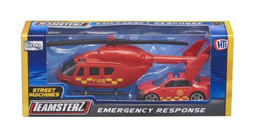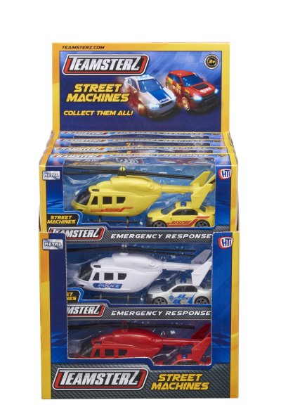 Sada obsahuje vrtulník s ručně otáčejícími se listy vrtule a zásahové auto. K dispozici v sortimentu 3 motivů; policie, hasiči a záchranáři. Perfektní dárek pro každého malého nadšeného řidiče, který nabízí hodiny nápadité zábavy! Napomáhá rozvoji sociálních dovedností, představivosti a jemné motoriky vašich nejmenších, protože mají ideální velikost pro hraní. Tlakově litá vozidla mají měřítko přibližně 3 palce a vyznačují se vysoce kvalitním tlakově litým skeletem karoserie a nezávislými volně pohyblivými koly. Vhodné pro věk 3+.