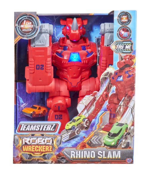 Teamsterz Robo Wreckerz Rhino Slam představuje unikátní hračku, která kombinuje prvky robota a zvířecího monstra v jednom produktu. Tento červený robot ve tvaru nosorožce je vyroben z pevného plastu a jeho výrazným rysem jsou modře svítící LED oči a světelný efekt na hrudi, které umocňují dojem akce a připravenosti k útoku. Ramena robota jsou robustní, s šedými detaily a průhlednými panely, které slouží jako závodní dráha pro malá autíčka, jež jsou součástí balení.