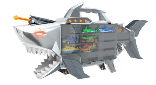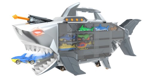 Pouzdro nabízí úložný prostor až pro 24 aut, takže si můžete vzít všechna svá oblíbená autíčka na dobrodružství. Navíc je vybaveno světly, zvuky, otevíracími čelistmi žraloka, vestavěnou rychlostní rampou a odpalovačem raket, který přidává akční prvek k hraní.