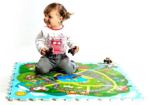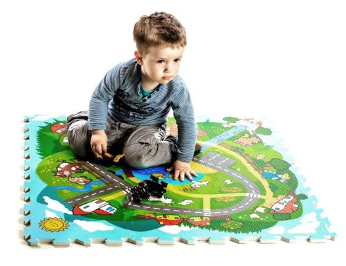 Zábavné hraní na vesnici! Pěnové podlahové puzzle bez vyjímatelných částí s barevnými zvířátky, domečky a silnicemi je ideální pro rozvoj dětské fantazie. Doplňte hrací plochu o libovolná autíčka, stromy, figurky lidí a zvířátek či stavby z kostek a sdílejte s dětmi jejich příběhy. Pěnový koberec je omyvatelný, zdravotně nezávadný, tlumí hluk a skvěle izoluje. Tloušťka 1,2 cm. Pro děti od 3 let. Otírejte vlhkým hadříkem.