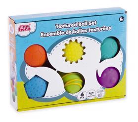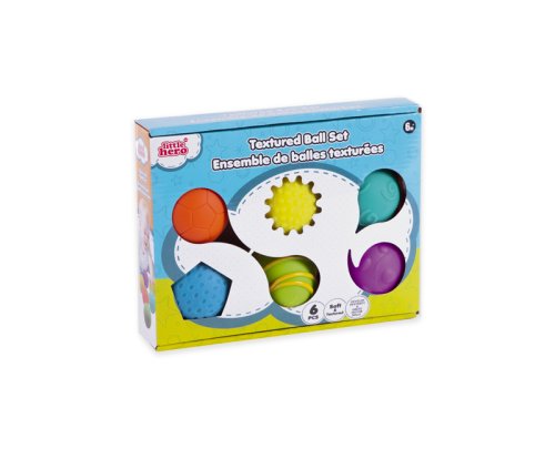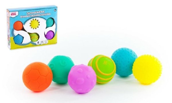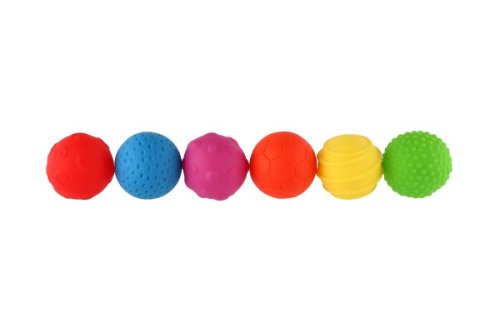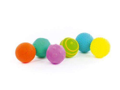 Sada 6 barevných gumových míčků. Každý míček má na svém povrchu jinou texturu. Průměr míčku 6 cm Rozměr krabice: 23 x 18 x 4 cm Vhodné od 6 měsíců