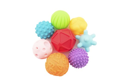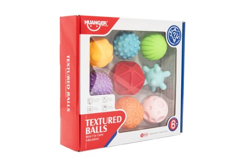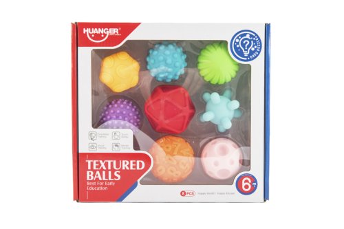 Sada 8 barevných gumových míčků. Každý míček má na svém povrchu jinou texturu. Průměr míčků 6-7 cm. Hračka rozvíjí u dětí motoriku, smyslové vnímání, trénuje myšlení. Rozměry balení 29 x 26 x 7 cm. Vhodné pro děti od 6 měsíců.
