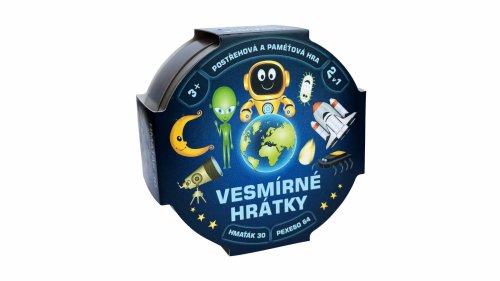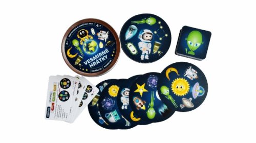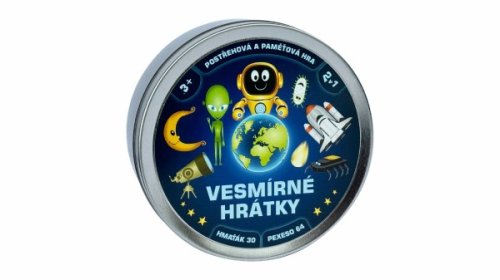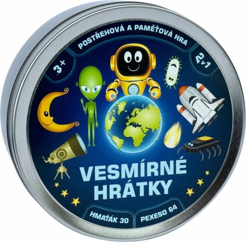 Zábavná karetní postřehová hra balená v malé plechové krabičce, to jsou Vesmírné hrátky, které obsahují 2 zábavné karetní hry: Hmaťáka a Pexeso. Děti si zábavnou formou zlepšují postřeh a paměť. Jednoduchá pravidla a krásně malované obrázky. Pro 2 a více hráčů. Vhodné pro děti od 3 let.
