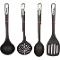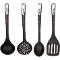 Sada náčiní 4 ks Lžíce s otvory na cezení Lžíce na vaření a servírování Obracečka s otvory k obracení ryb a masa Naběračka pro servírování tekutých pokrmů V černé a červené barvě