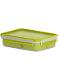 Obdélníková dóza s objemem 1,2 l Systém uzavírání se 4 klipy po stranách Součástí 2 misky co se vejdou dovnitř Bezpečné pro použití v mikrovlnné troubě, mrazničce a myčce V zelené barvě