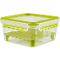 Obdélníková dóza s objemem 1,3 l Systém uzavírání se 4 klipy po stranách Součástí rozdělení na dvě patra Udržuje jídlo déle čerstvé díky těsnění V zelené barvě