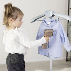 Ruční napařovací žehlička pro malé hospodyňky je jako opravdová, inspirovaná napařovačem oděvů Tefal Pure POP. S funkcí skutečné páry po stisknutí tlačítka. 3 barevné kombinace (bílá, černá, bronzová). Rozměry žehličky (DxŠxV): 3,5 x 8 x 18 cm.