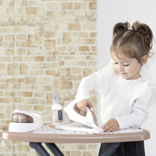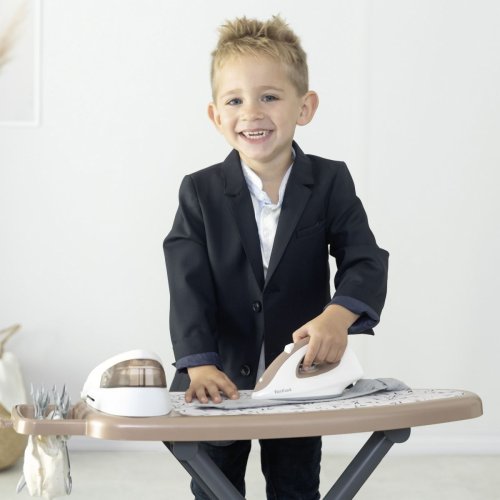 Realistické žehlicí prkno s parní stanicí Tefal, včetně žehličky s mechanickým otočným knoflíkem se zvukem "crick-crack". Součástí 2 ramínka, 4 kolíčky na prádlo a lahvička se sprejem na prádlo. Žehlicí prkno lze rychle složit. Rozměry produktu (DxŠxV): 23x 48 x 48,5 cm.