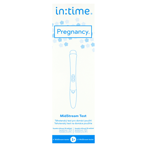 Těhotenský test MidStream je určen pro domácí použití a slouží k detekci raného těhotenství z moči. Má vysokou citlivost 25 mIU/ml a spolehlivost přesahující 99 %. Zachycuje hormon hCG, který tělo produkuje během těhotenství. Výsledek testu je možné odečíst již za 40 sekund. Použití je jednoduché, rychlé a vhodné pro každodenní domácí testování.