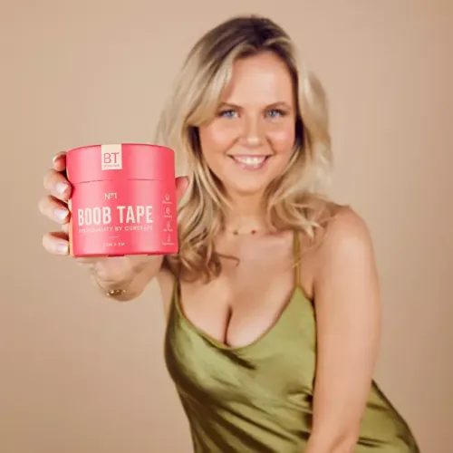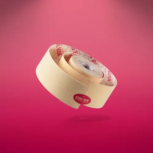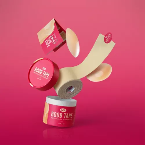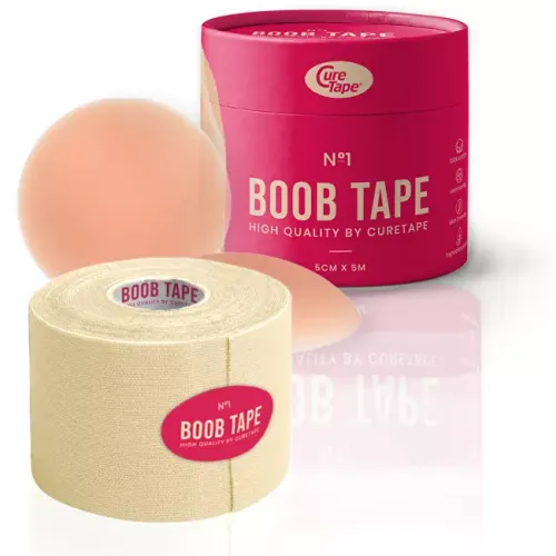Boob Tape je prodyšná páska na prsa z bavlny s hypoalergenním lepidlem, odolná vůči vodě i potu. Poskytuje přirozenou oporu bez podprsenky a obsahuje silikonové chrániče bradavek. Rozměry jedné role tejpu jsou 5 cm x 5 m. Součástí balení jsou silikonové krytky na bradavky.