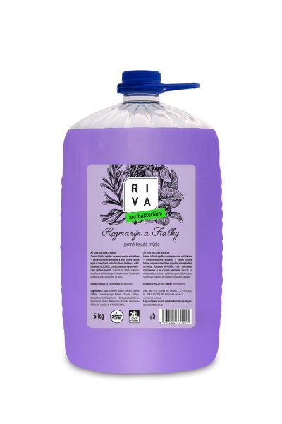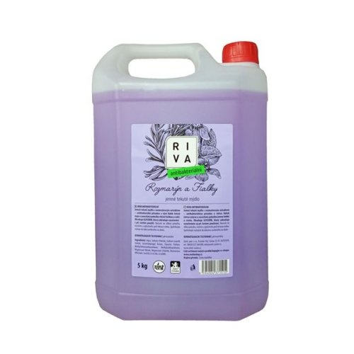 Jemné tekuté mýdlo s antibakteriální přísadou Šetrně myje a zanechává pokožku vláčně hebkou a svěží Vůně rozmarýn a fialky Obsahuje glycerin Objem: 5 litrů